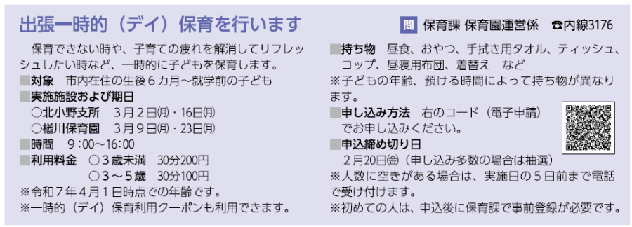 子育て 出張一時的(デイ)保育を行います 21/36 前の記事 次の記事 発行日 : 2026年02月01日 自治体名 : 長野県塩尻市 広報紙名 : 広報しおじり 令和8年2月号 Tweet シェアする 2月の納期限 くらしの情報~講座・教室~