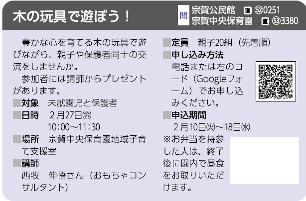 子育て 木の玩具で遊ぼう! 25/36 前の記事 次の記事 発行日 : 2026年02月01日 自治体名 : 長野県塩尻市 広報紙名 : 広報しおじり 令和8年2月号 Tweet シェアする くらしの情報~図書館~ くらしの情報~伝言板~