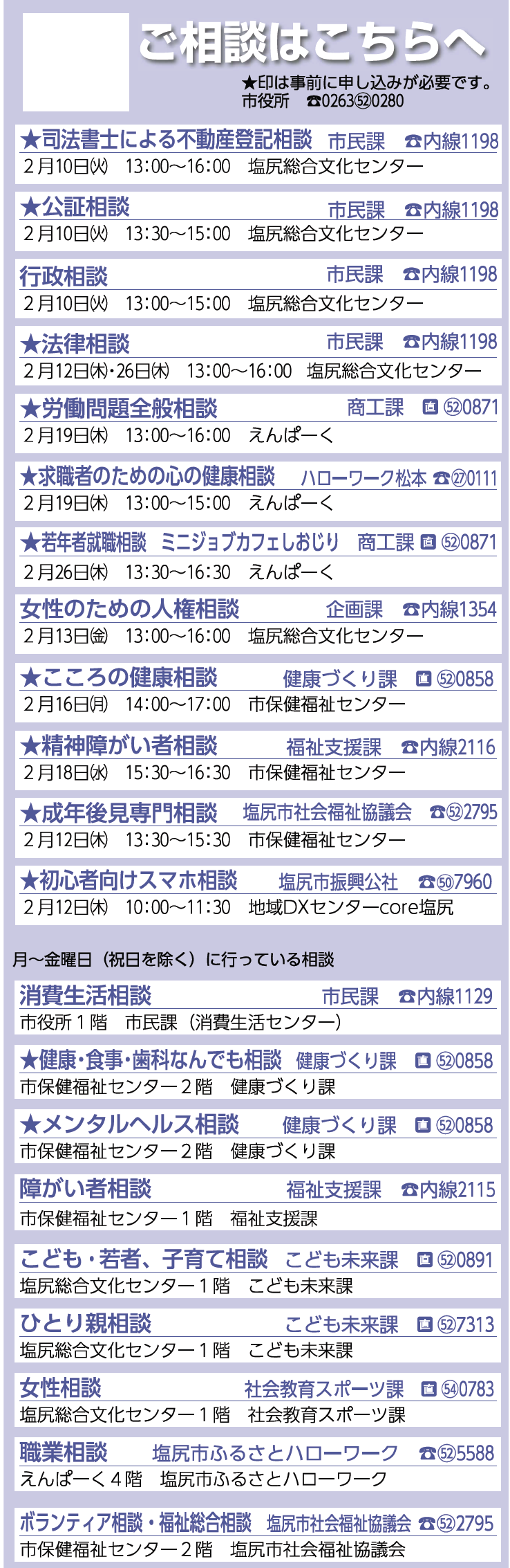 くらし ご相談はこちらへ 32/36 前の記事 次の記事 発行日 : 2026年02月01日 自治体名 : 長野県塩尻市 広報紙名 : 広報しおじり 令和8年2月号 Tweet シェアする 休日の当番医等 みんなのひろば