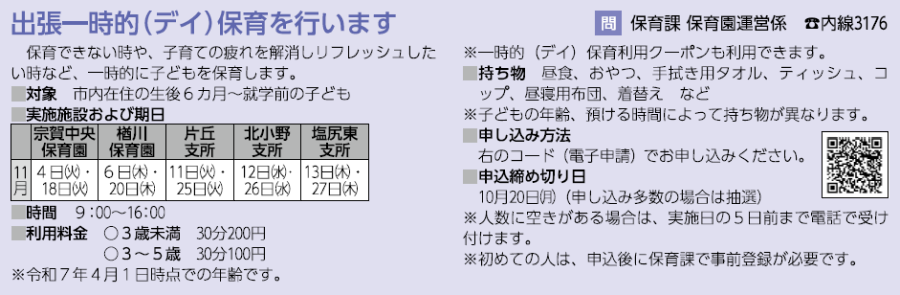 子育て 出張一時的(デイ)保育を行います 11/31 前の記事 次の記事 発行日 : 2025年10月01日 自治体名 : 長野県塩尻市 広報紙名 : 広報しおじり 令和7年10月号 Tweet シェアする くらしの情報~お知らせ~ くらしの情報~募集~