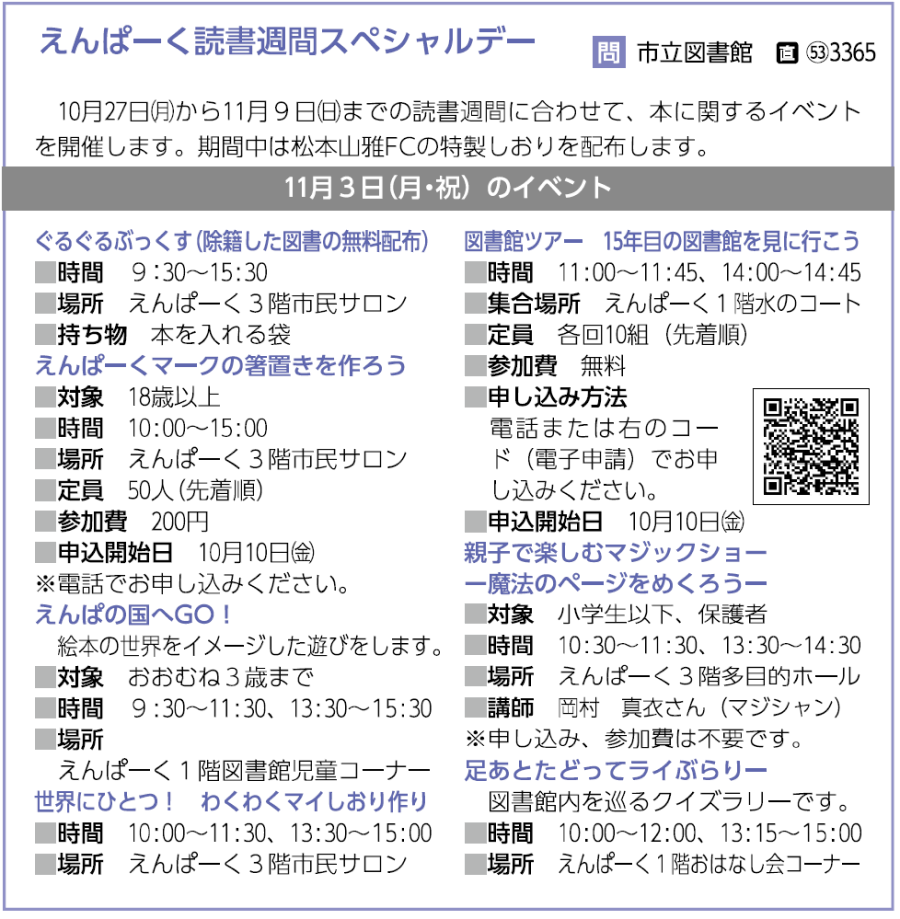 イベント えんぱーく読書週間スペシャルデー 19/31 前の記事 次の記事 発行日 : 2025年10月01日 自治体名 : 長野県塩尻市 広報紙名 : 広報しおじり 令和7年10月号 Tweet シェアする くらしの情報~子育て~ くらしの情報~図書館~