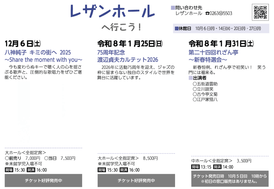 イベント レザンホールへ行こう! 26/31 前の記事 次の記事 発行日 : 2025年10月01日 自治体名 : 長野県塩尻市 広報紙名 : 広報しおじり 令和7年10月号 Tweet シェアする 塩尻市民秋の文化祭出店・出展者を募集 YOUMEX ARENA(ユメックスアリーナ) ~イベント情報~