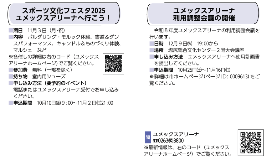 イベント YOUMEX ARENA(ユメックスアリーナ) ~イベント情報~ 27/31 前の記事 次の記事 発行日 : 2025年10月01日 自治体名 : 長野県塩尻市 広報紙名 : 広報しおじり 令和7年10月号 Tweet シェアする レザンホールへ行こう! 休日の当番医等