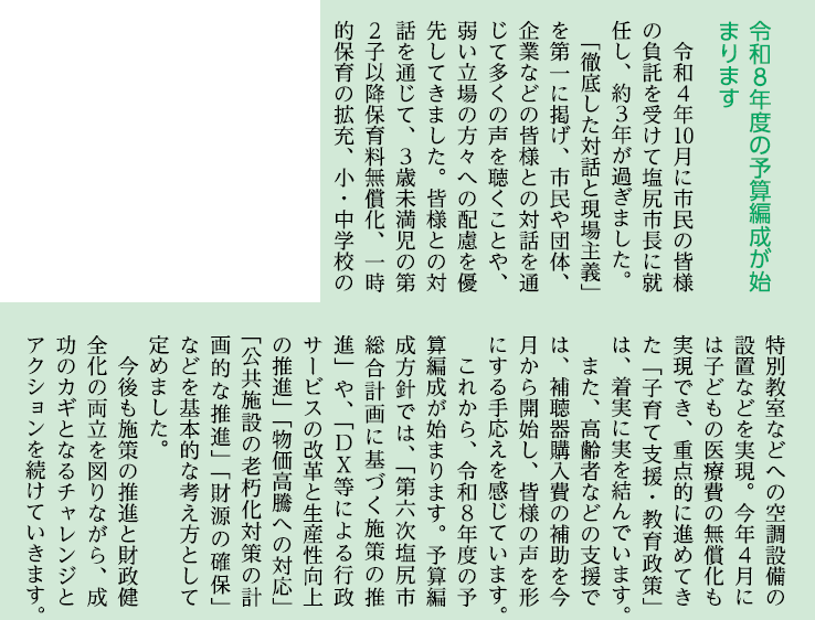 くらし 市長が投げる球 Part6 11/42 前の記事 次の記事 発行日 : 2025年11月01日 自治体名 : 長野県塩尻市 広報紙名 : 広報しおじり 令和7年11月号 Tweet シェアする 塩尻の給食で食卓に笑顔を!おやつ こんこんレシピ 市政トピックス(1)