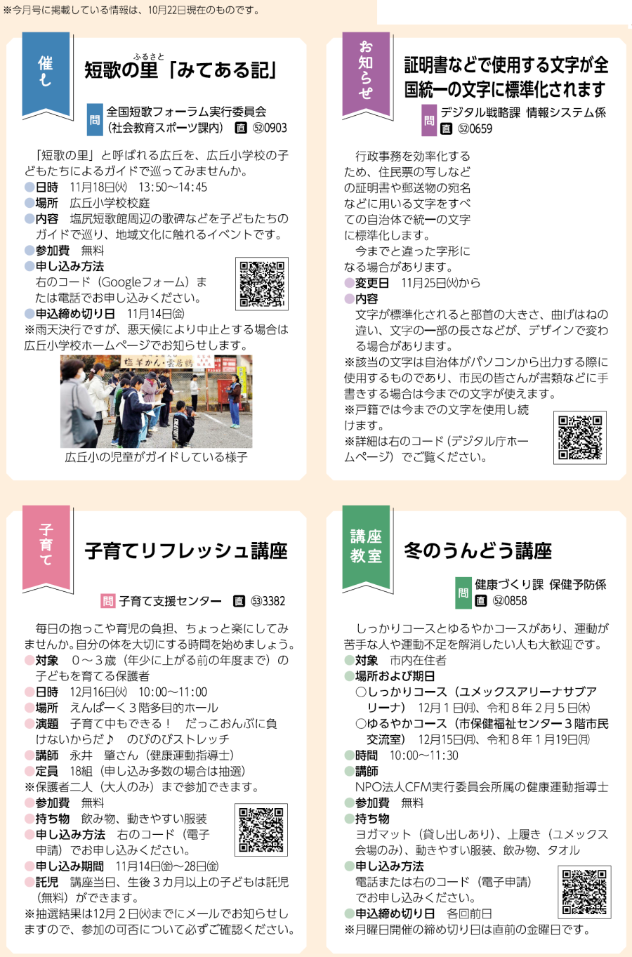 くらし 市政トピックス(1) 12/42 前の記事 次の記事 発行日 : 2025年11月01日 自治体名 : 長野県塩尻市 広報紙名 : 広報しおじり 令和7年11月号 Tweet シェアする 市長が投げる球 Part6 市政トピックス(2)