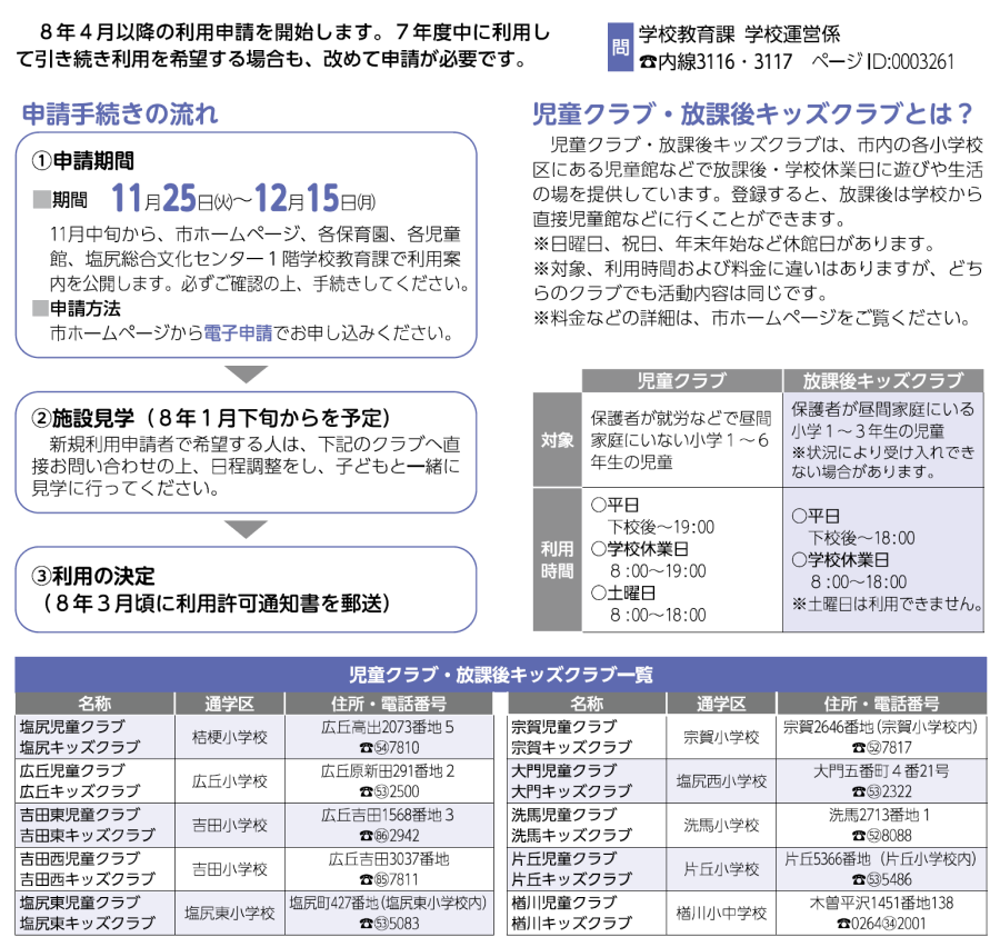 子育て 令和8年度 児童クラブ・放課後キッズクラブ 利用申請のご案内 14/42 前の記事 次の記事 発行日 : 2025年11月01日 自治体名 : 長野県塩尻市 広報紙名 : 広報しおじり 令和7年11月号 Tweet シェアする 市政トピックス(2) 出張一時的(デイ)保育を行います