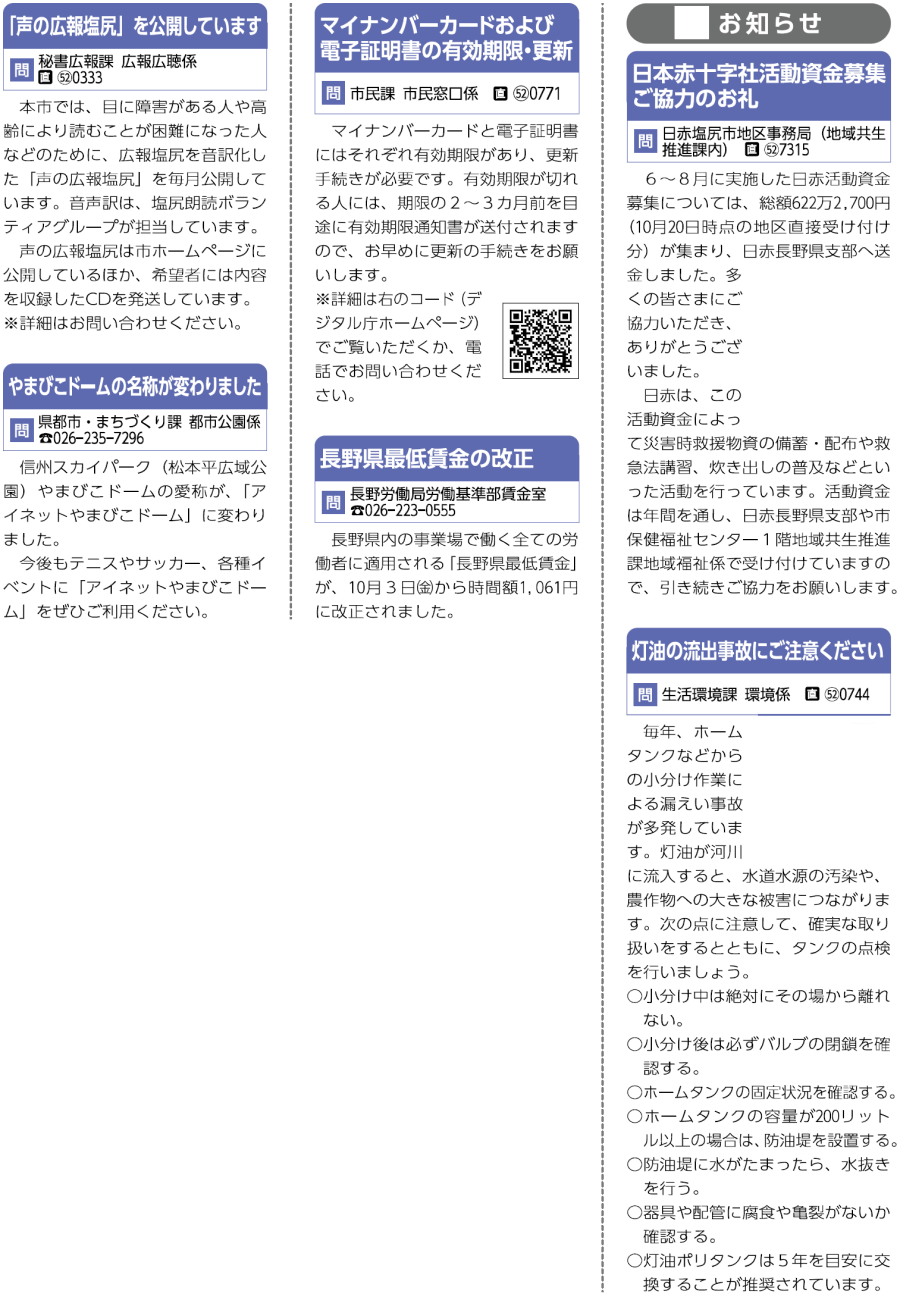 くらし くらしの情報~お知らせ(1)~ 17/42 前の記事 次の記事 発行日 : 2025年11月01日 自治体名 : 長野県塩尻市 広報紙名 : 広報しおじり 令和7年11月号 Tweet シェアする 秋の火災予防運動 くらしの情報~お知らせ(2)~