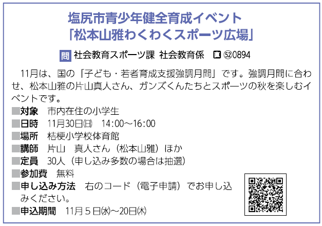 スポーツ 塩尻市青少年健全育成イベント「松本山雅わくわくスポーツ広場」 25/42 前の記事 次の記事 発行日 : 2025年11月01日 自治体名 : 長野県塩尻市 広報紙名 : 広報しおじり 令和7年11月号 Tweet シェアする 県生涯学習推進センター講座 くらしの情報~図書館~