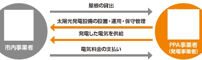 市内の事業者が所有する建物の屋根などを、PPA事業者(発電事業者)に貸し出し、PPA事業者が設置した太陽光発電設備から電気を購入する仕組みです。