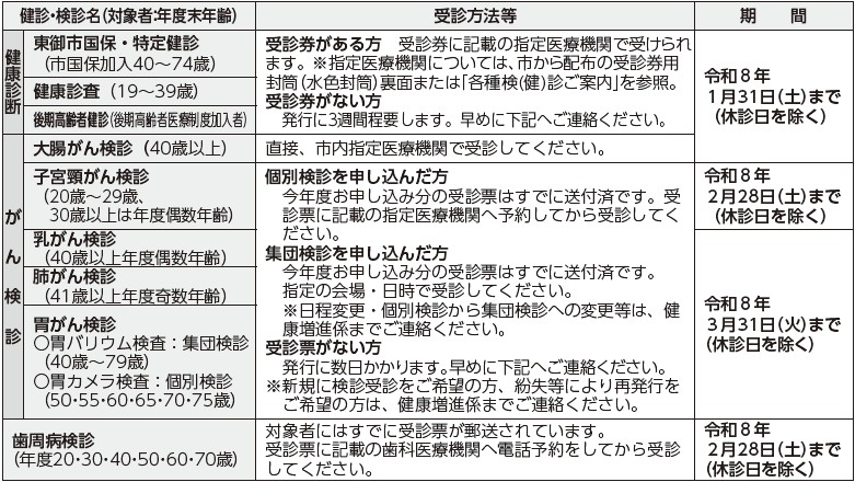 令和7年度の受診期間がまもなく終了となります。持病の治療は継続し、健康診断・がん検診等は、適切に受けましょう。