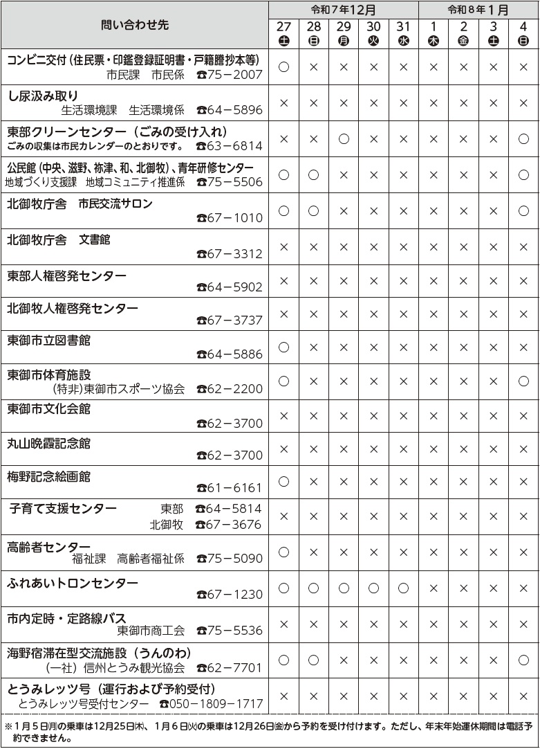 くらし 年末年始の市関係施設の休業・休館・運休のお知らせ 10/33 前の記事 次の記事 発行日 : 2025年12月01日 自治体名 : 長野県東御市 広報紙名 : 市報とうみ 2025年12月号 Tweet シェアする 東御市温泉施設等 年末年始の営業時間 情報コーナー【募集】