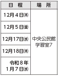 日時:12月3日(水)、12月17日(水)午前10時~正午(予定)
