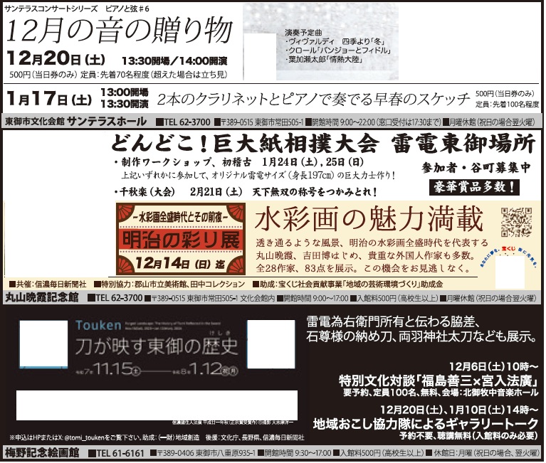 イベント 文化会館・美術館のイベント情報 32/33 前の記事 次の記事 発行日 : 2025年12月01日 自治体名 : 長野県東御市 広報紙名 : 市報とうみ 2025年12月号 Tweet シェアする 休日・夜間の救急医療案内 その他のお知らせ(市報とうみ 2025年12月号)