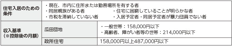※入居を許可するにあたっては、2名の連帯保証人が連署した入居誓約書、連帯保証人の印鑑証明書、所得証明書、納税証明書などの市が指定する書類と敷金(家賃3カ月分)が必要です。