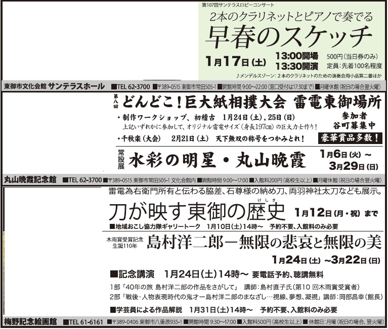 イベント 文化会館・美術館のイベント情報 38/39 前の記事 次の記事 発行日 : 2026年01月01日 自治体名 : 長野県東御市 広報紙名 : 市報とうみ 2026年1月号 Tweet シェアする 休日・夜間の救急医療案内 その他のお知らせ(市報とうみ 2026年1月号)