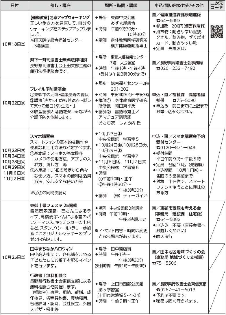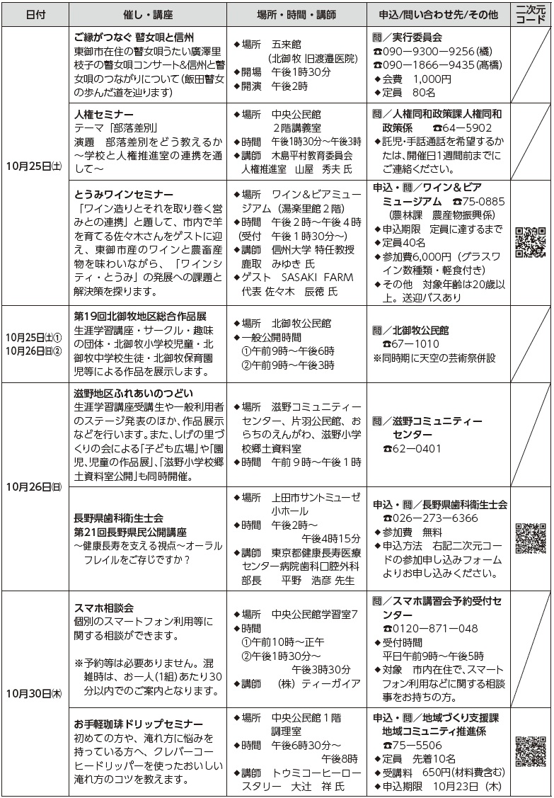 講座 催し・講座情報(1) 13/39 前の記事 次の記事 発行日 : 2025年10月01日 自治体名 : 長野県東御市 広報紙名 : 市報とうみ 2025年10月号 ※詳細は二次元コードをご覧ください Tweet シェアする 情報コーナー【補助金】 催し・講座情報(2)