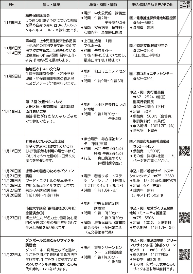 イベント 催し・講座情報(2) 14/39 前の記事 次の記事 発行日 : 2025年10月01日 自治体名 : 長野県東御市 広報紙名 : 市報とうみ 2025年10月号 ※詳細は二次元コードをご覧ください Tweet シェアする 催し・講座情報(1) 子育てインフォメーション