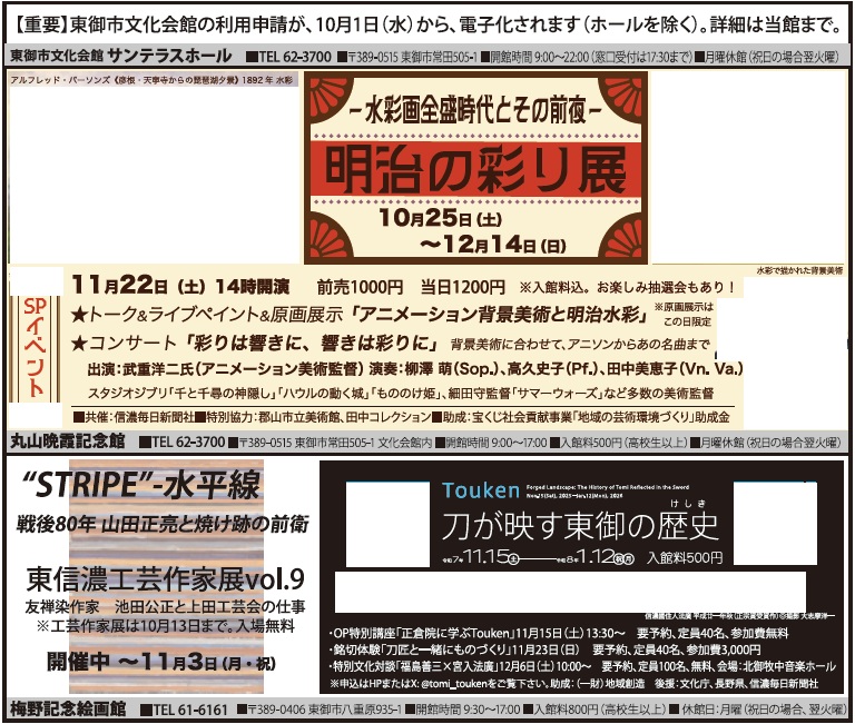 イベント 文化会館・美術館のイベント情報 38/39 前の記事 次の記事 発行日 : 2025年10月01日 自治体名 : 長野県東御市 広報紙名 : 市報とうみ 2025年10月号 Tweet シェアする 休日・夜間の救急医療案内 その他のお知らせ(市報とうみ 2025年10月号)
