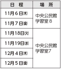 日時:11月5日(水)、11月19日(水)午前10時~正午(予定)