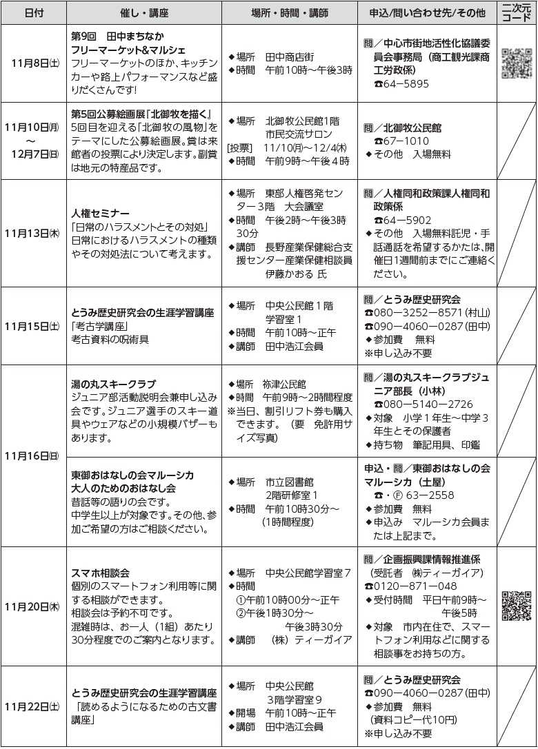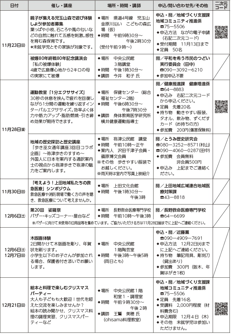 講座 催し・講座情報 13/35 前の記事 次の記事 発行日 : 2025年11月01日 自治体名 : 長野県東御市 広報紙名 : 市報とうみ 2025年11月号 ※詳細は二次元コードをご覧ください Tweet シェアする 情報コーナー【募集(2)】 子育てインフォメーション