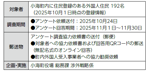 小海町では、町内に暮らす外国人住民の生活実態や課題を把握し、今後の多文化共生のまちづくり施策に活かすことを目的として、令和7年(2025年)11月に「多文化まちづくりアンケート調査」を実施しました(表1)。対象は町内に住民登録のある外国人住民192人で、93人から回答を得ており、回答率は50%となりました。アンケートは5か国語で実施し、ベトナム語の回答が最も多く、次いでインドネシア語、日本語となりました。