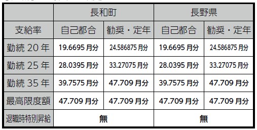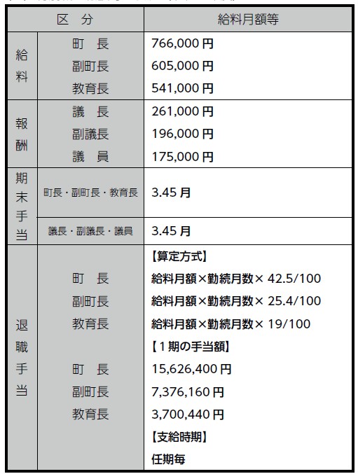 ※退職手当の「1期の手当額」は、4月1日現在の給料月額および支給率に基づく1期(町長・副町長…4年=48月、教育長…3年=36月)勤めた場合における退職手当の見込額です。
