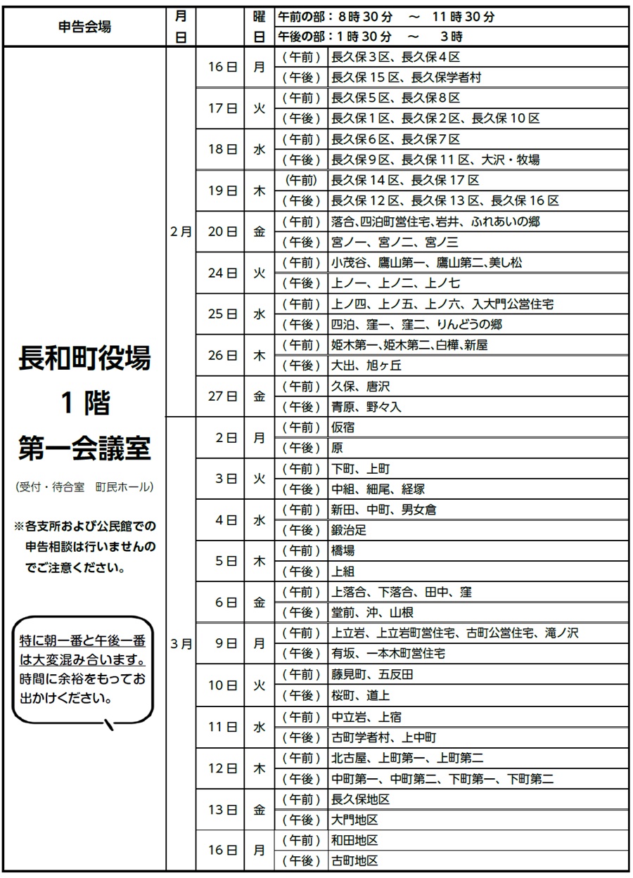 くらし 町県民税・所得税の申告会場と日程 24/37 前の記事 次の記事 発行日 : 2026年01月01日 自治体名 : 長野県長和町 広報紙名 : 広報ながわ 令和8年1月号 問合せ:住民生活課 税務係 【電話】75-2063 Tweet シェアする 上田税務署での確定申告 マイナンバーを使った スマホ申告講習会
