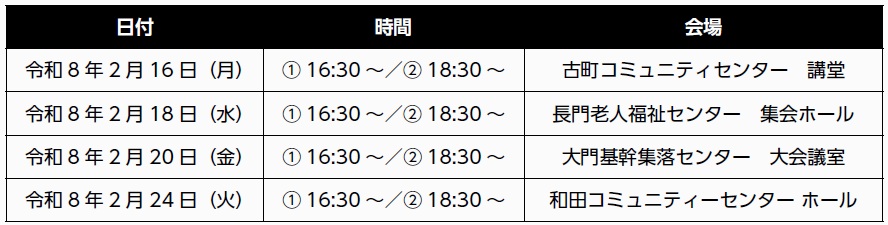 説明会は各日2回((1)16:30~/(2)18:30~)開催し、内容は同じです。ご都合にあわせて、どの会場にもご参加いただけます。新しい分別ルールを正しくご理解いただき、より快適で清潔なまちづくりにご協力ください。多くの皆さまのご参加をお待ちしております。
