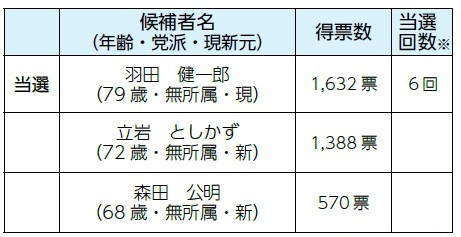 今回の町長選挙は、6期目を目指す羽田健一郎氏と新人の森田公明氏と立岩としかず氏の3人が立候補しました。
