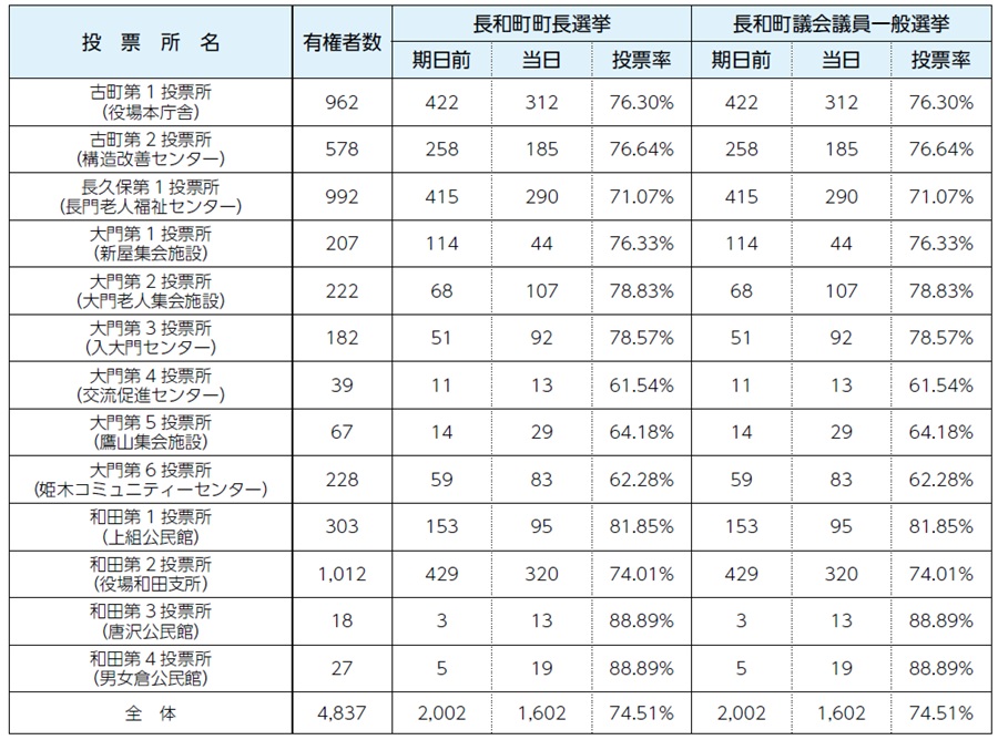 町長選挙・町議会議員一般選挙の投票率は、町長選挙が74.51%(前回比3.33ポイント減)、町議会議員一般選挙が74.51%(前回比3.31ポイント減)となりました。