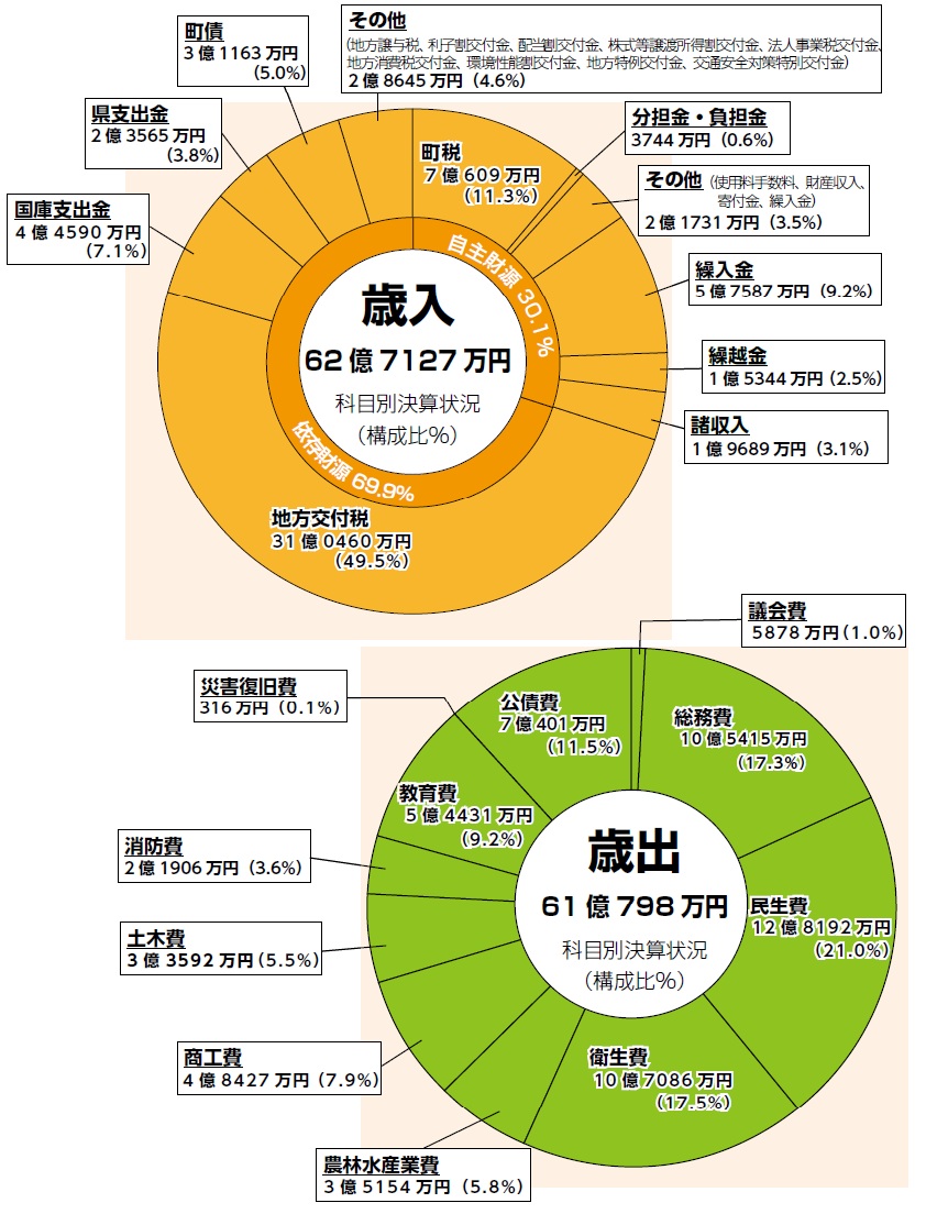 歳入構成のうち主なものは、地方交付税49・5%、町税11・3%、繰入金9・2%となっています。