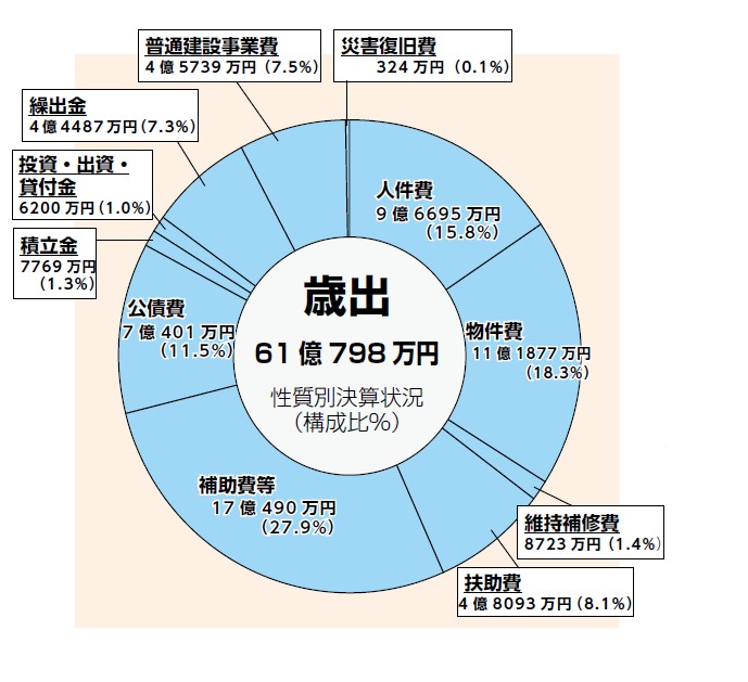 歳出の性質別構成のうち主なものは、支出が義務づけられ、任意に削減することが困難な「義務的経費」(人件費・扶助費・公債費)が35・2%、普通建設事業費等の「投資的経費」が7・5%となりました。