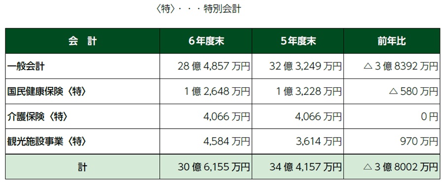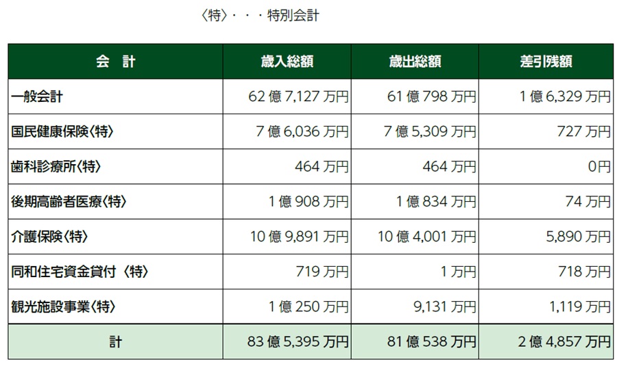 令和6年度一般会計決算額は、歳入62億7127万円、歳出61億798万円、歳入歳出差引額は1億6328万円となりました。繰越事業等に係る財源2108万円を差し引いた実質収支額は1億4220万円となりました。