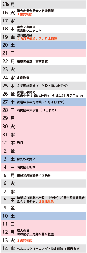くらし 2025.12.15~2026.1.14 町のうごき 18/22 前の記事 次の記事 発行日 : 2025年12月08日 自治体名 : 長野県高森町 広報紙名 : 広報高森「あったかもり」 令和7年12月号 左記の「町のうごき」へのごみ収集日程の掲載を終了いたしました。ごみ収集日程は、「ごみ収集カレンダー」および「ごみ分別アプリさんあ~る」でご確認ください。 Tweet シェアする カメラリポート 2025.9~11 〜たかもりタイムズ〜 本の森つうしん