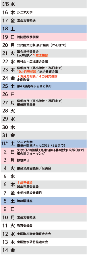 くらし 2025.10.15~2025.11.14 町のうごき 25/29 前の記事 次の記事 発行日 : 2025年10月08日 自治体名 : 長野県高森町 広報紙名 : 広報高森「あったかもり」 令和7年10月号 左記の「町のうごき」へのごみ収集日程の掲載を終了いたしました。ごみ収集日程は、「ごみ収集カレンダー」および「ごみ分別アプリさんあ~る」でご確認ください。 Tweet シェアする カメラリポート 2025.8・9 〜たかもりタイムズ〜 本の森通信