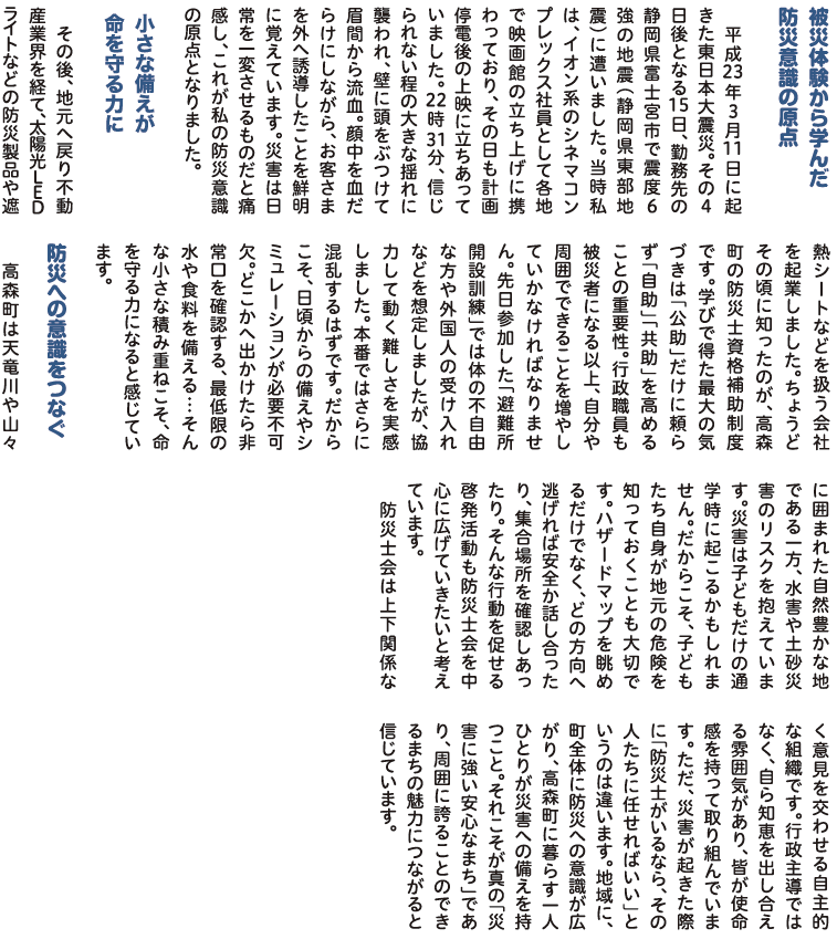 くらし [特集]未来を守る防災のチカラ 〜「もしも」に備えて 今、私たちにできること〜(3) 3/29 前の記事 次の記事 発行日 : 2025年10月08日 自治体名 : 長野県高森町 広報紙名 : 広報高森「あったかもり」 令和7年10月号 Tweet シェアする [特集]未来を守る防災のチカラ 〜「もしも」に備えて 今、私たちにできること〜(2) [特集]未来を守る防災のチカラ 〜「もしも」に備えて 今、私たちにできること〜(4)