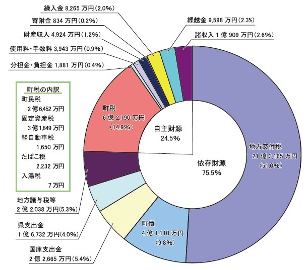 歳入では、地方交付税が3.2%の増、町税が1.0%の減、町債が9.6%の減、歳入の不足を補う基金取崩による繰入金は24.9%の減となりました。