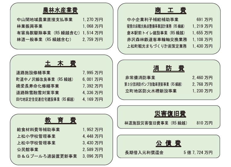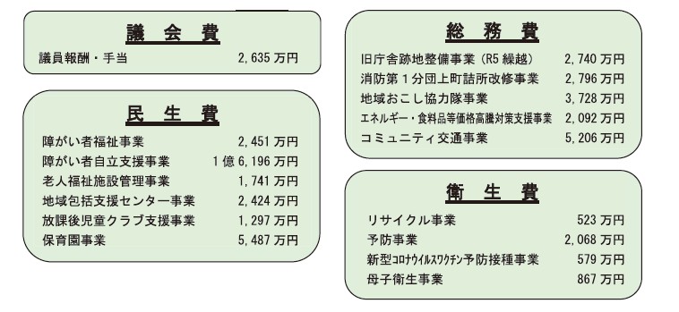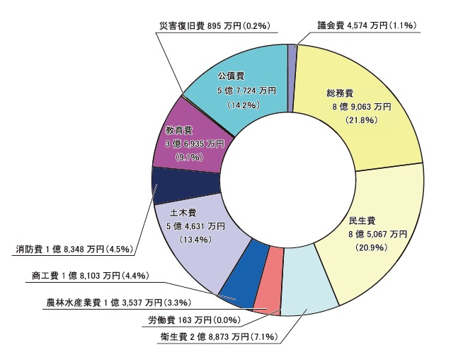 歳出は、総務費が5.5%減の8億9,063万円、民生費が27.0%減の8億5,067万円、商工費が52.8%増の1億8,103千円、土木費が18.4%増の5億4,631万円、消防費が12.6%増の1億8,348万円、教育費が13.9%増の3億6,935万円、災害復旧費が89.8%減の895万円、公債費が2.8%増の5億7,724万円となりました。