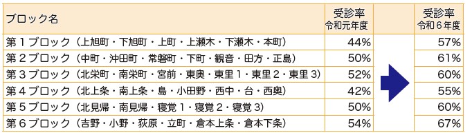 60%を達成しているブロックが多くあり、健診を受けることが習慣化されてきているのではないかと思います。