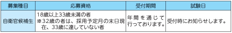 採用後「自衛官候補生」(特別職国家公務員)に任命され、自衛官となるために必要な基礎的教育訓練に専念する新しい採用制度です。自衛官候補生として所要の教育を経て3ヶ月後に2等陸・海・空士(任期制自衛官)に任官します。