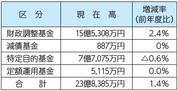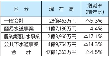 一般会計における村債(村の借金)の残高は28億463万円(村民一人当:112万円)で前年度より1億5,646万円減少(村民1人当は4万円減少)し、基金(村の貯金。定額運用基金は除く)の残高は23億3,270万円(村民一人当:93万円)で前年度より3,203万円増加(村民一人当も3万円増加)しました。