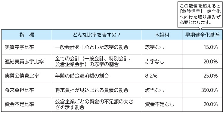木祖村は赤字や資金不足がないため、実質公債費比率を除く全ての項目で数値が算出されませんでした。また、実質公債費比率についても危険度を示す25%を下回っており、村の財政は健全といえます。