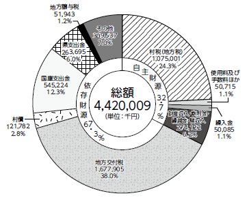 自主財源・依存財源:村税や施設使用料など、村が自らの収入とすることができるお金が「自主財源」。地方交付税、国庫・県支出金など、国や県から交付されるお金と借入金が「依存財源」