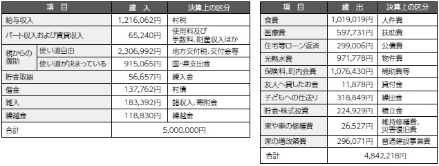 自治体の決算は金額が大きすぎて、想像がつかないので、年収500万円の家庭の家計簿にしました。