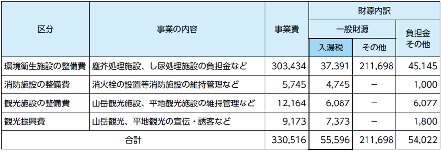 入湯税は、特定の目的に使われる目的税です。観光振興(観光施設の整備を含む)、温泉保護(鉱泉源の保護管理)、消防・環境施設の整備に使われます。納税される方々に納得いただける使い方に努めます。