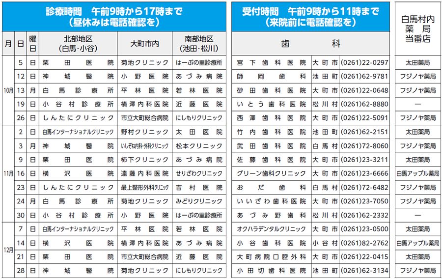 ※当番医が変更になることがあります。その場合事前に無線放送・ホームページ等でお知らせします。