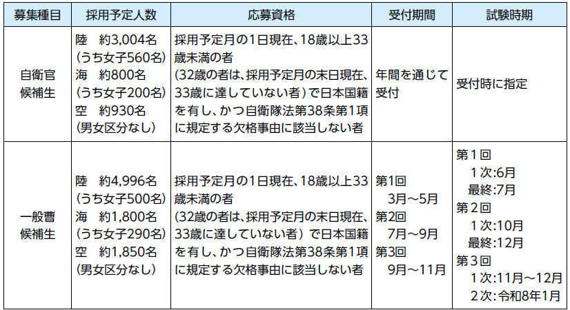 防衛省では、以下の予定で令和7年度各募集種目の受付及び採用試験を実施します。