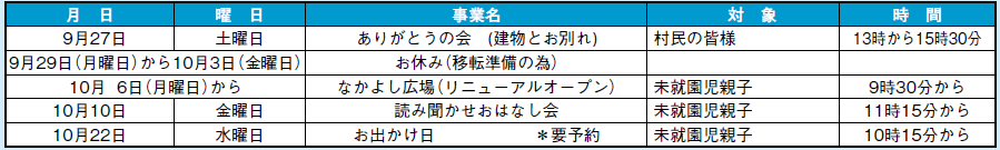 ・移転準備の為、9月29日(月曜日)から10月3日(金曜日)まで、子育て支援ルームはお休みさせていただきます。