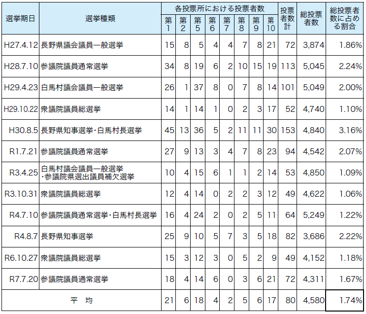 ※同日執行の選挙の場合は、村長選挙または村議会議員選挙の数値を記載しています。