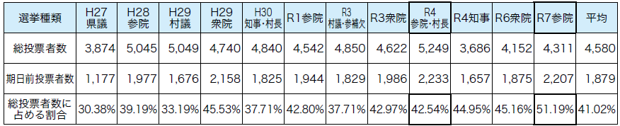 期日前投票所の利用者は増加傾向にあり、本年の参院選では51.19%、期日前投票期間が短い村長選でも42.54%(令和4年)でした。